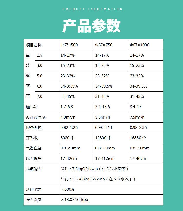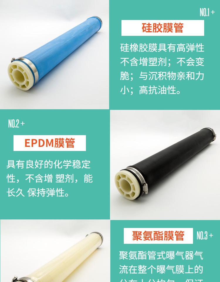 曝氣膜管采用三元乙丙橡膠(EPDM)材料,具有耐熱、耐臭氧、耐酸堿、化學(xué)穩(wěn)定性好等特點(diǎn),與一般橡膠膜相比,可大大提高其使用壽命。