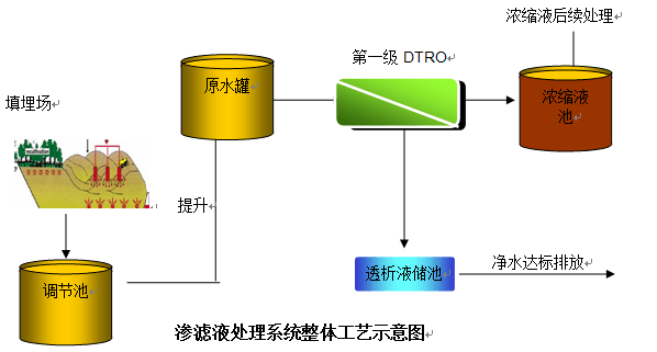 調節池滲濾液經泵提升至滲濾液原水儲罐,進行pH值調節、砂濾器、保安過濾器等簡單預處理后,進入單級DTRO,經DTRO處理后產生的透過液排放,DTRO的濃水排至濃縮液儲池等待進一步處理DTRO工藝整體處是流程如下圖所示: